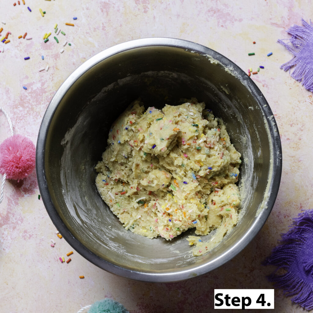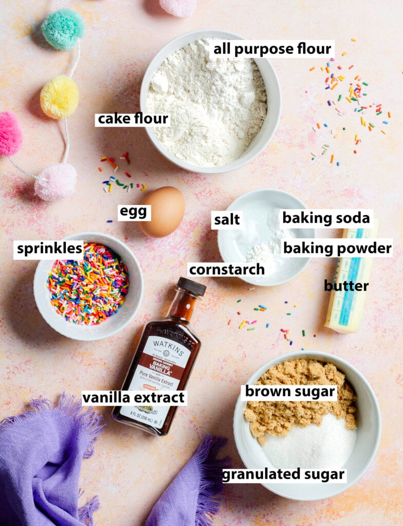 - Mix all the dry ingredients except for the granulated and brown sugar (all-purpose flour, cake flour, cornstarch, sprinkle jimmies, baking soda & salt) in a bowl and set aside.