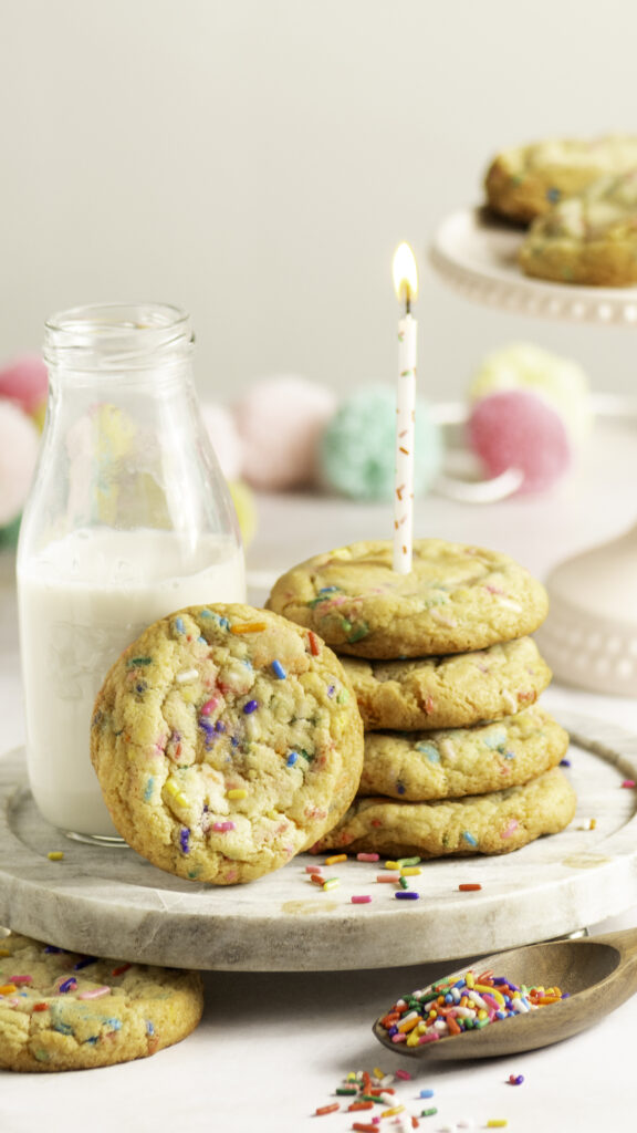 These funfetti birthday cookies are perfect for any occasion but I chose them as (one of) my dessert of choice this because they are just SO good! Perfectly soft, chewy and buttery cookies with the distinct flavor of sprinkle jimmies sprinkled throughout. What more could a girl ask for?