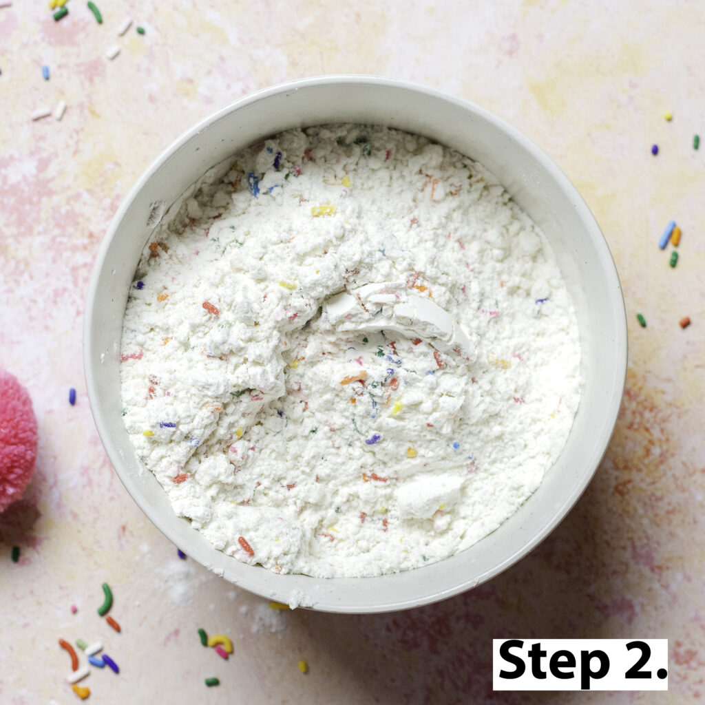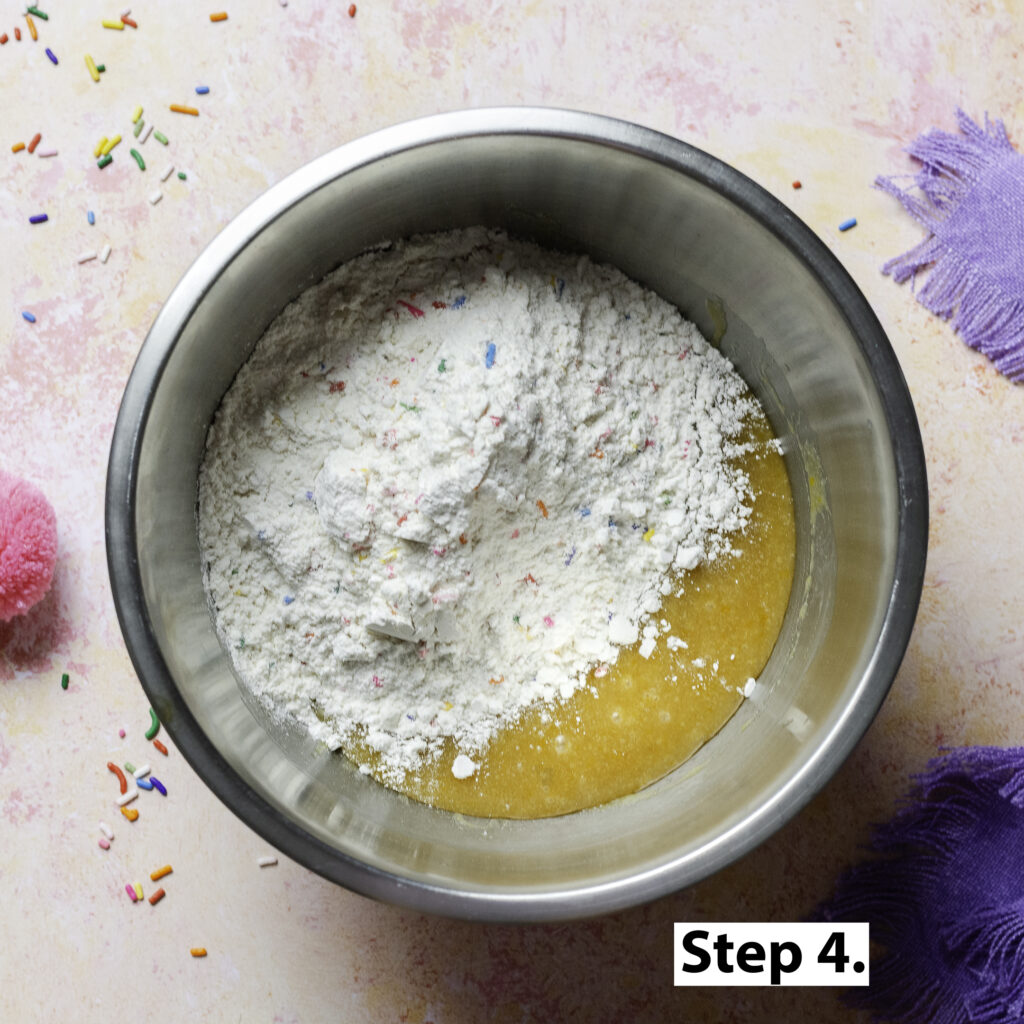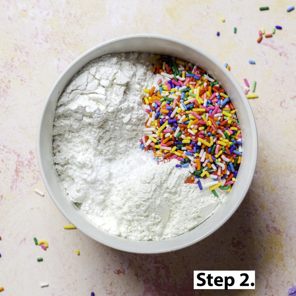 Step 2. Mix all the dry ingredients except for the granulated and brown sugar (all-purpose flour, cake flour, cornstarch, sprinkle jimmies, baking soda & salt) in a bowl and set aside.