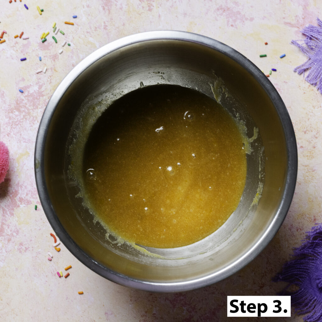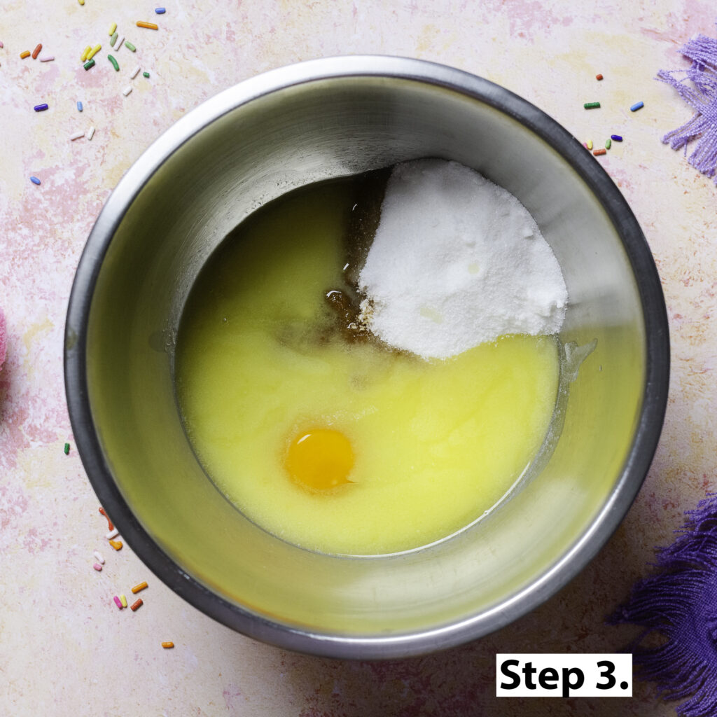 Step 3. In a separate mixing bowl add the melted butter along with the granulated sugar, brown sugar, egg and vanilla extract then mix until combined.
