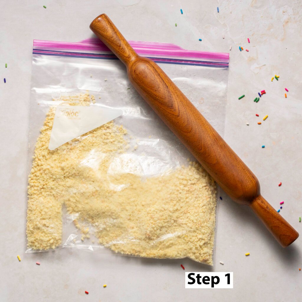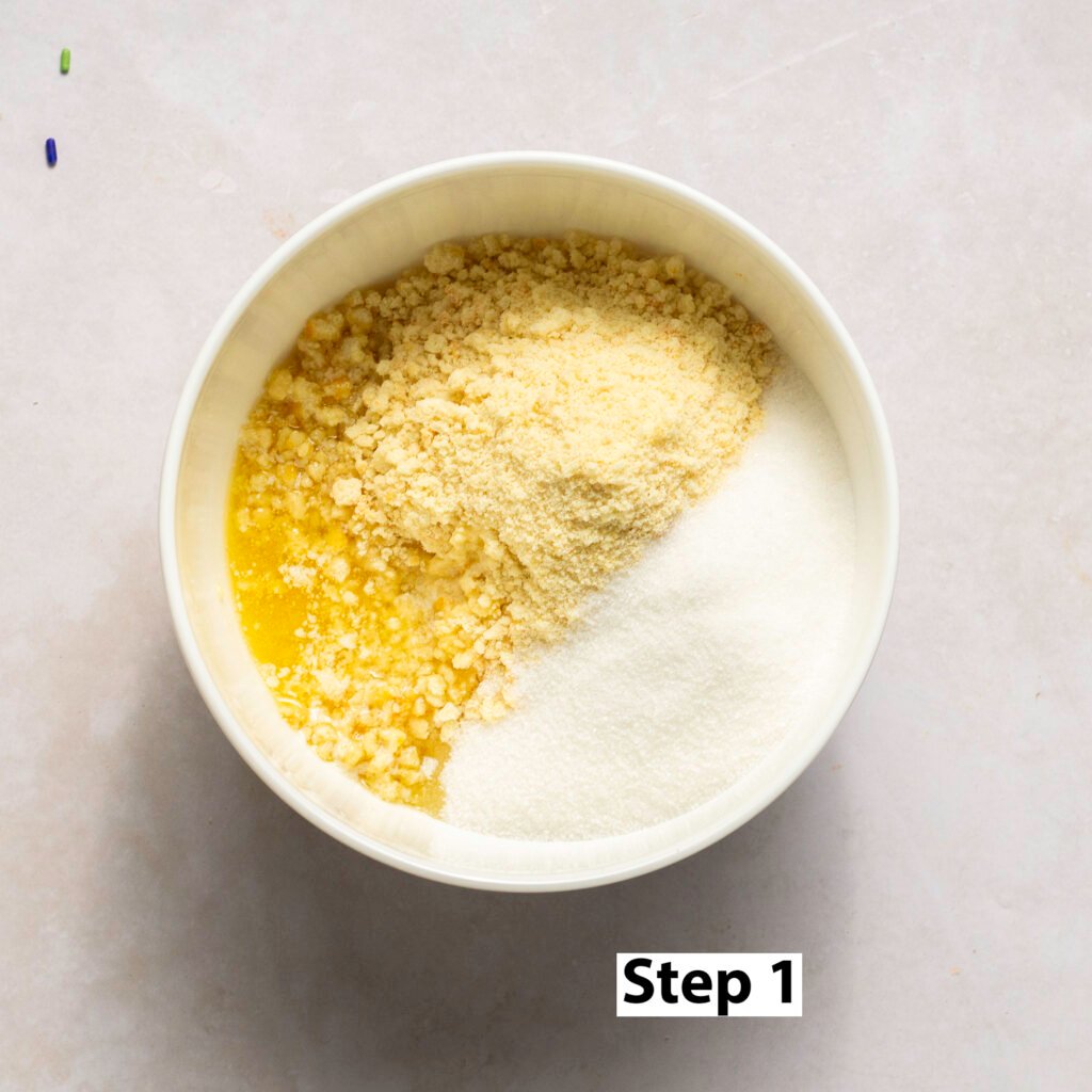 - Crush the cookies then add to a bowl along with the granulated sugar and melted butter. Mix until there are no dry spots