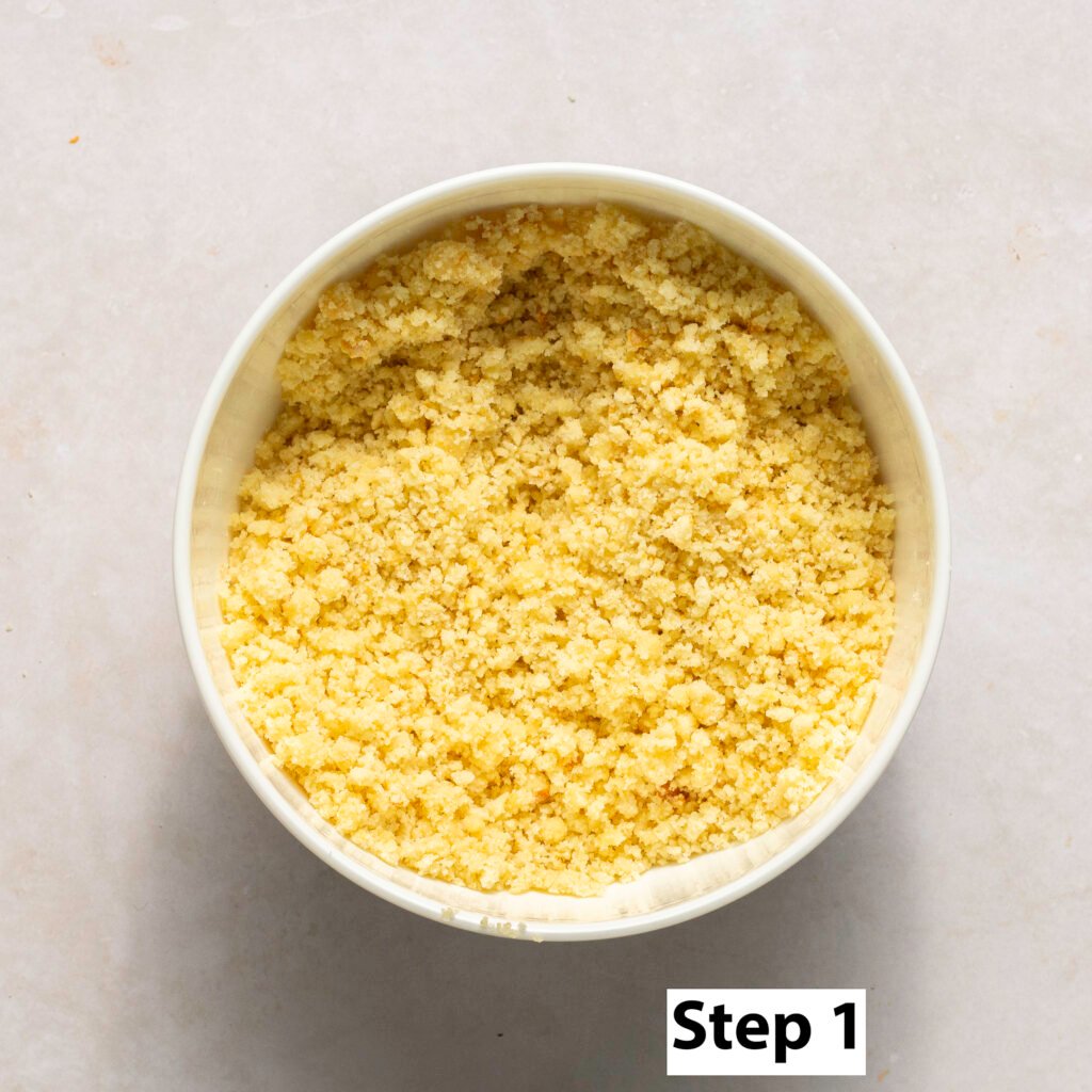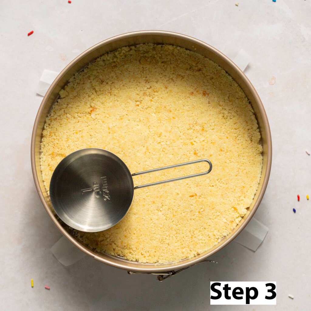 Step 3. Add the butter cookie crust mixture to the prepared springform pan and press into the bottom using a flat bottomed cup or other instrument. Set aside.