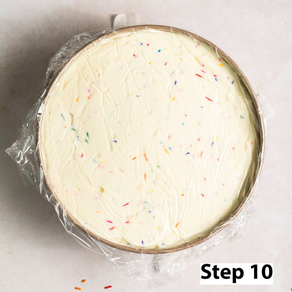 Step 11. Refrigerate the cheesecake for at least 6 hours to allow it to set. Once set gently remove your finished white chocolate funfetti cheesecake from the springform pan.