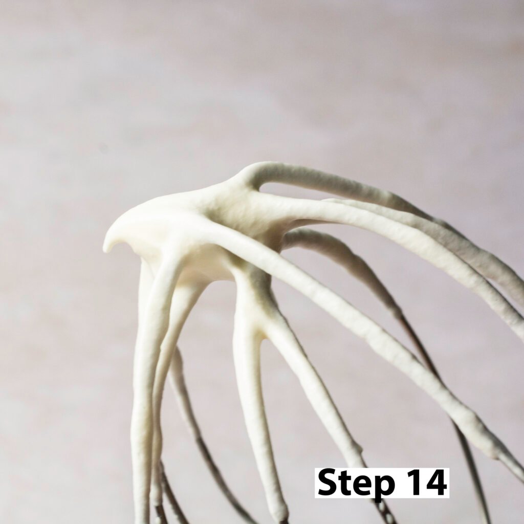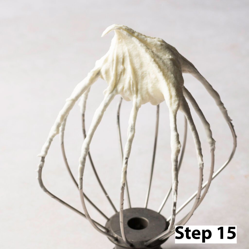 Step 15. Set your mixer to medium -high speed while slowly pouring in the melted gelatin down the inside of the bowl. Avoid pouring the gelatin directly on the whisk as this can cause ribbons of unincorporated gelatin in the whipped cream.