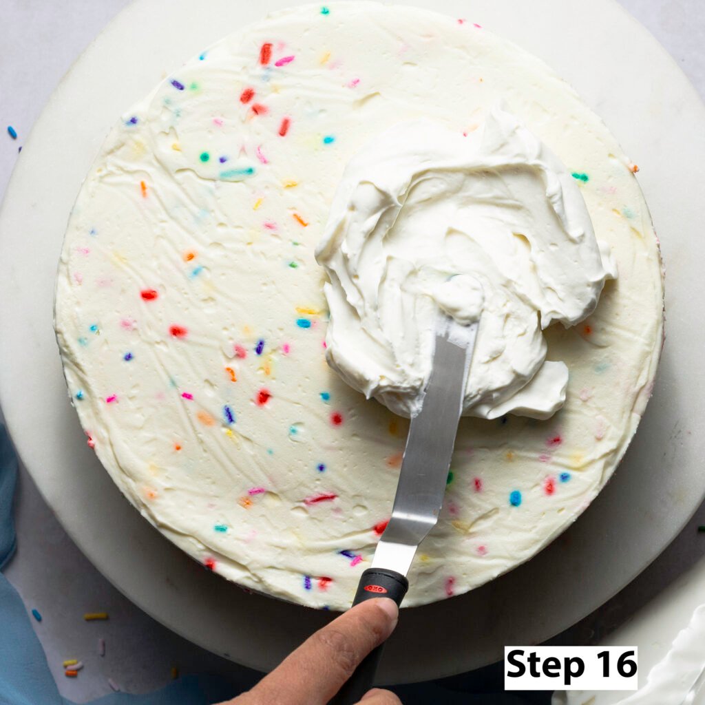 Step 16. Using an offset spatula, spread half of the whipped cream across the top of the cheesecake in an even layer.