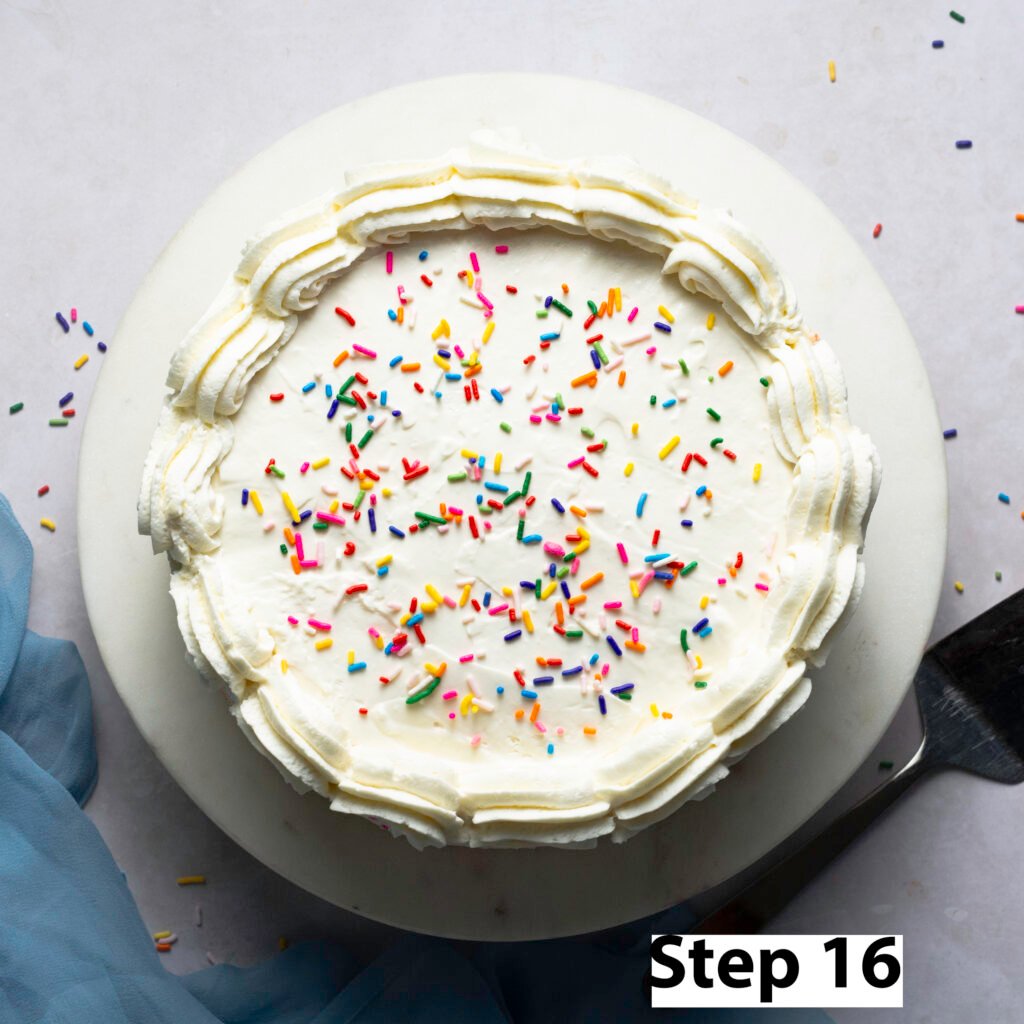 - Add the rest of the whipped cream to a piping bag with your favorite piping tip and pipe a border around the edge of your cheesecake. Decorate with additional sprinkle jimmies if desired.Keep refrigerated until ready to serve.