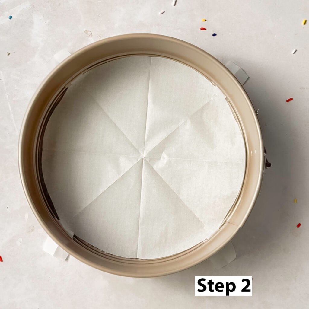 Step 2. Grease your springform pan with a neutral-flavored oil and then add a parchment circle (cut out with tabs for easy transfer) to the bottom of the springform pan.