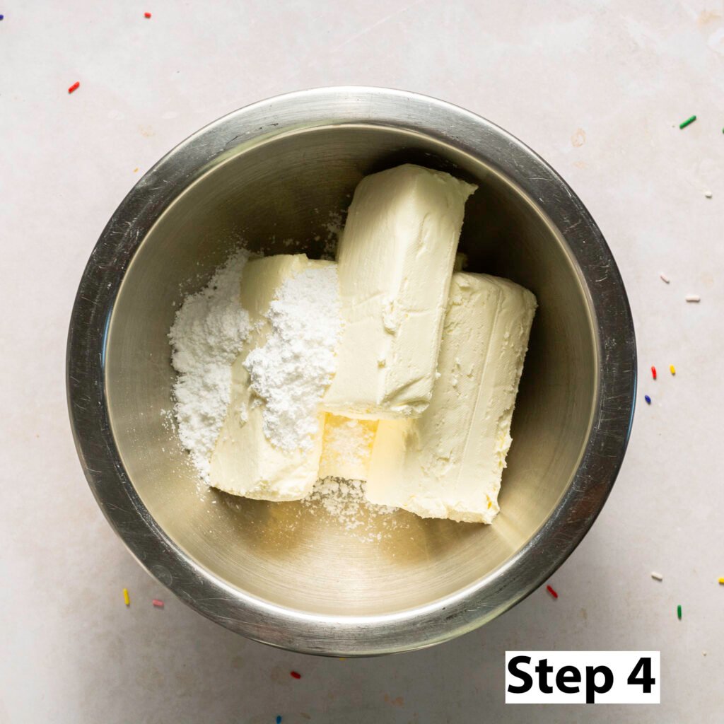 Step 4. Now prepare the cheesecake filling. Add all the cream cheese and ¼ cup of the confectioner's sugar to the bowl of a stand mixer and whip until smooth. A hand mixer is also appropriate for this recipe.