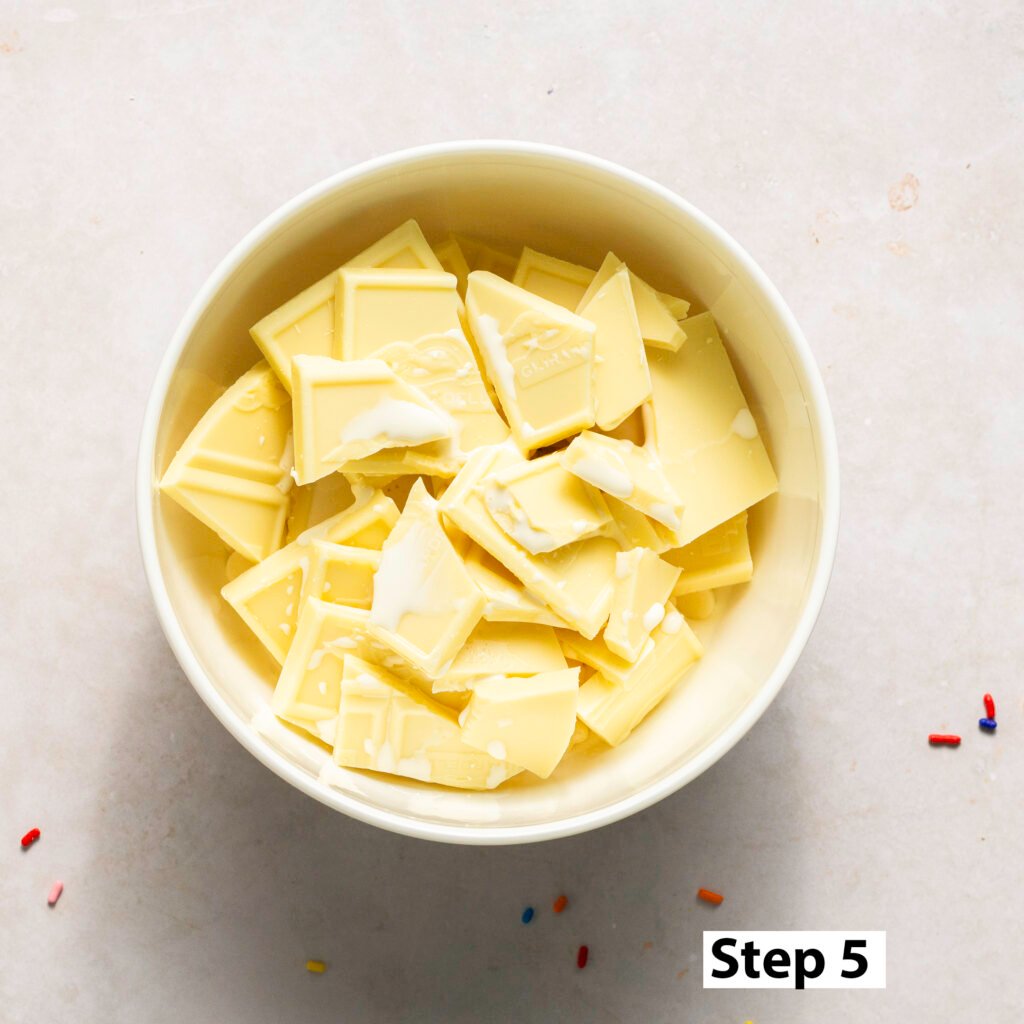 Step 5. In a separate, microwave-safe bowl add the white-chocolate and ½ a cup of the heavy cream. Microwave in 20-second increments until chocolate is completely melted. Stir the mixture in between microwaving to ensure there are no hotspots that can cause the white chocolate to seize.
