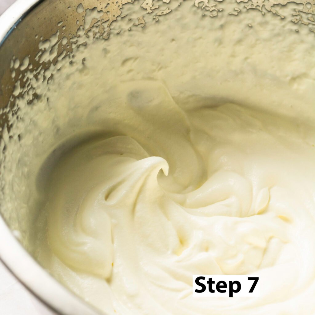 - With your mixer on medium speed, slowly pour the melted white chocolate/heavy cream mixture into the whipped cream cheese mixture from step 1 until all the white chocolate is incorporated.