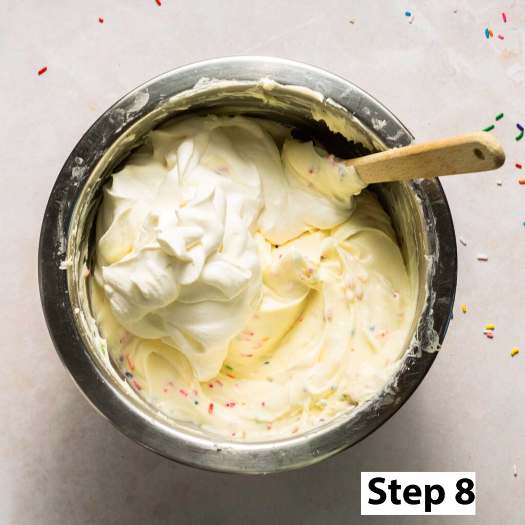 - Add the whipped cream and sprinkle jimmies to the cream cheese/white chocolate mixture fold in until evenly combined. Make sure to fold gently to prevent deflating the whipped cream as much as possible