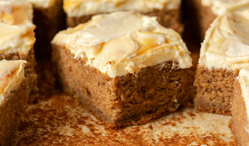 - Use the back of the spoon again to swirl the caramel gently into the cream cheese frosting. Serve at room temperature.