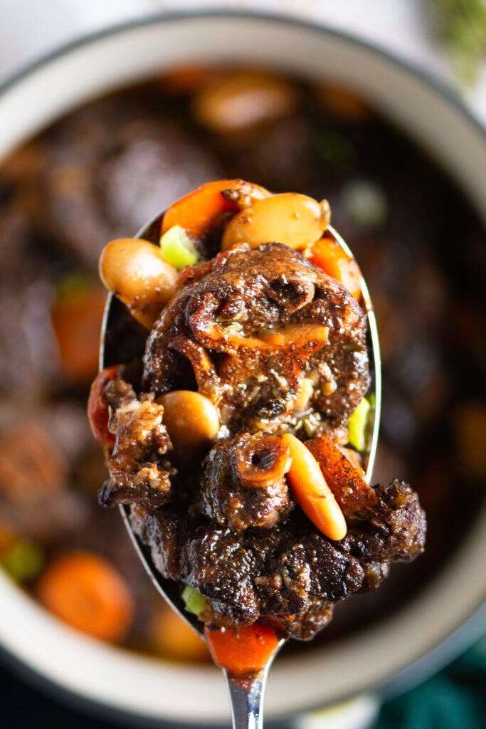 This braised Jamaican oxtail recipe is as traditional it gets! Tender cuts of bone-in beef braised in beef stock along with fresh herbs and vegetables - its the ultimate Jamaican Sunday dinner!