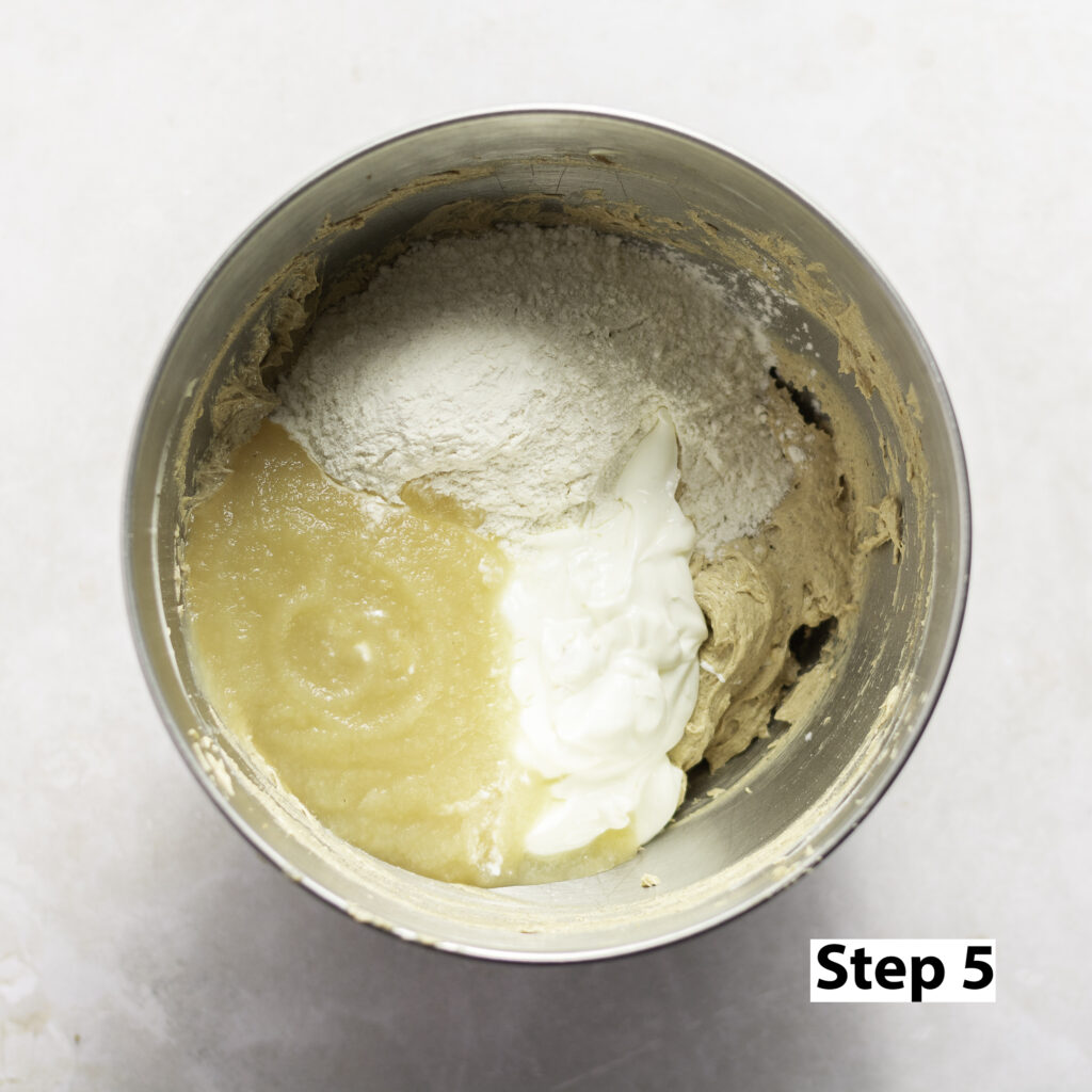 Step 5. Add the applesauce, greek yogurt and cake flour mixture to the mixing bowl and mix on the lowest speed until completely incorporated.