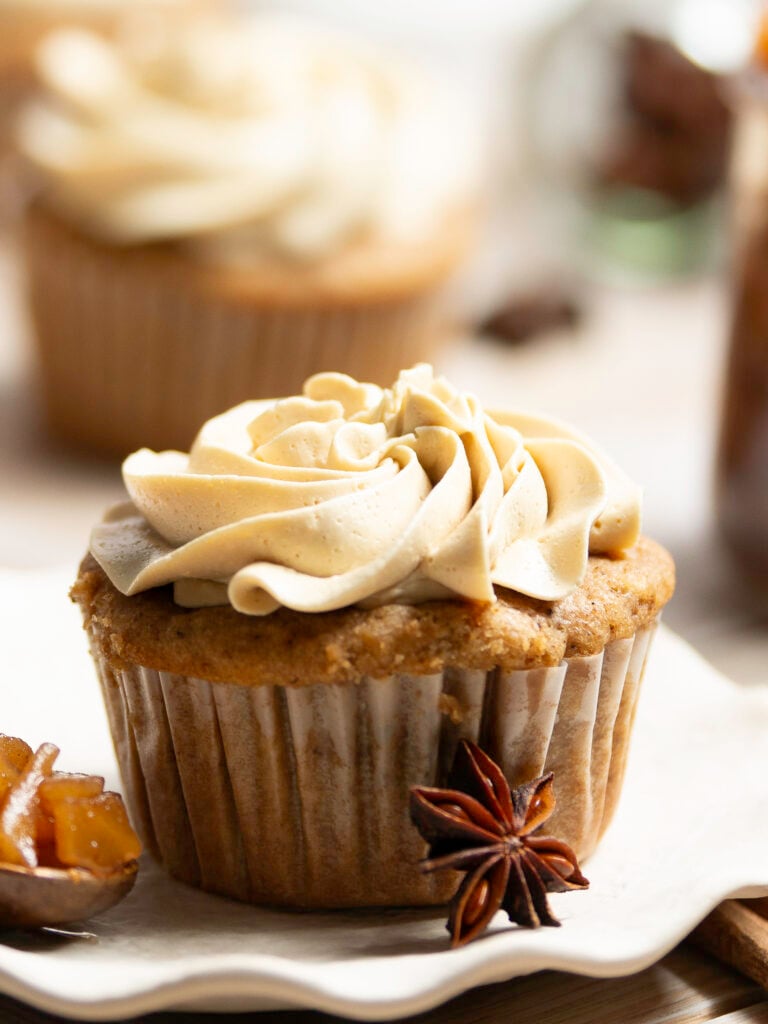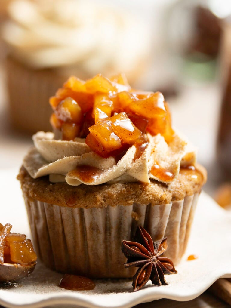 If you're looking for pie alternatives for your thanksgiving dessert table let me introduce you to these chai-spiced apple pie cupcakes! They're easy but more importantly, delicious! The cupcakes feature freshly ground and classic chai spices - star anise, cardamom, cloves and, yes, a pinch of black pepper for an ever-so-slight zing! To top it all off they're crowned with a decadent but airy brown sugar Swiss meringue buttercream, a sprinkle of cinnamon sugar and a generous spoonful of a sweet and tart apple pie topping to tie everything together!