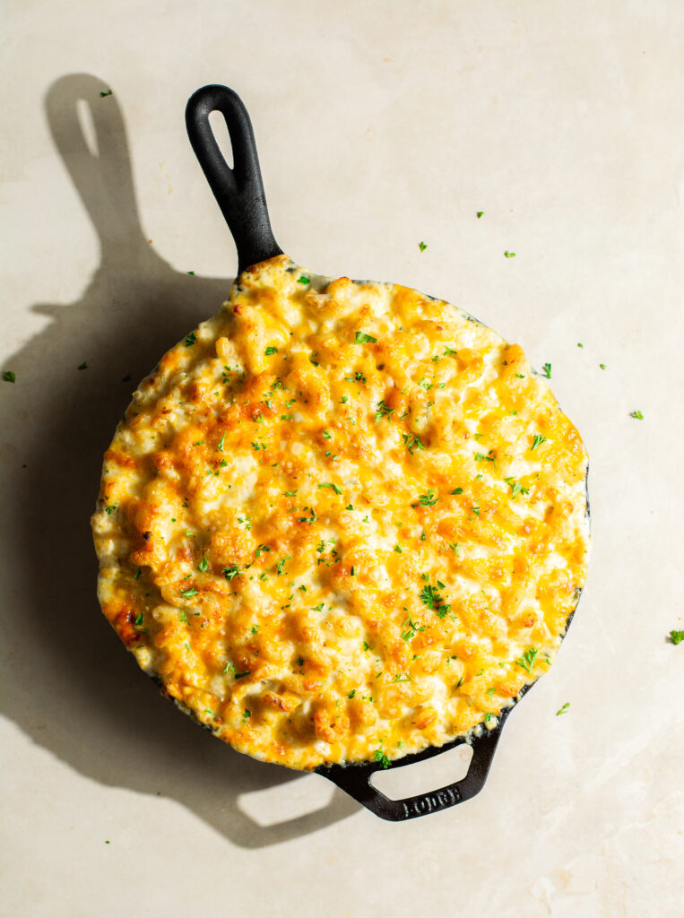 There's been lots of discourse this year about the "right" way to make mac & cheese - to roux or not to roux? Eggs or no eggs? Well this crab mac & cheese chooses a third door - neither. The cheese are simply melted down in a cheese sauce before being tossed with the pasta for a luxuriously creamy pasta!