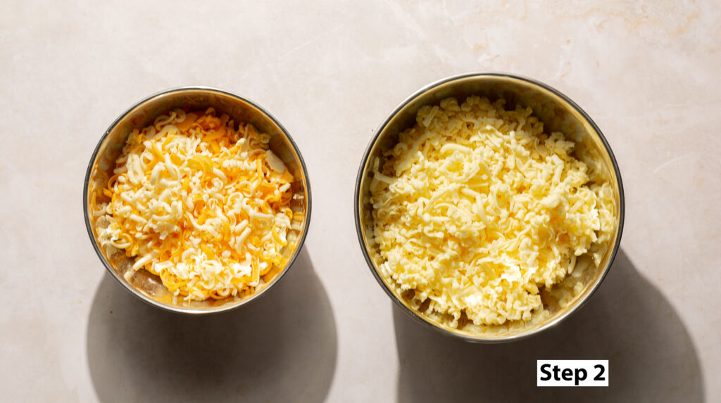- Shred the cheeses. Mix the extra sharp white cheddar and 8 ounces of the fontina cheese together in one bowl for the cheese sauce. Add the mild yellow cheddar and the remaining 8 ounces of the fontina to a separate bowl for layering the crab mac & cheese. Set both aside.