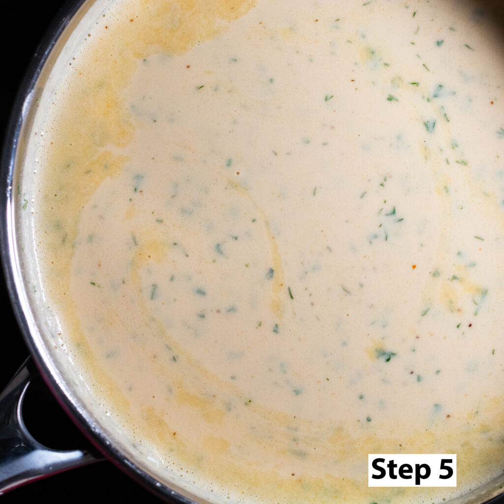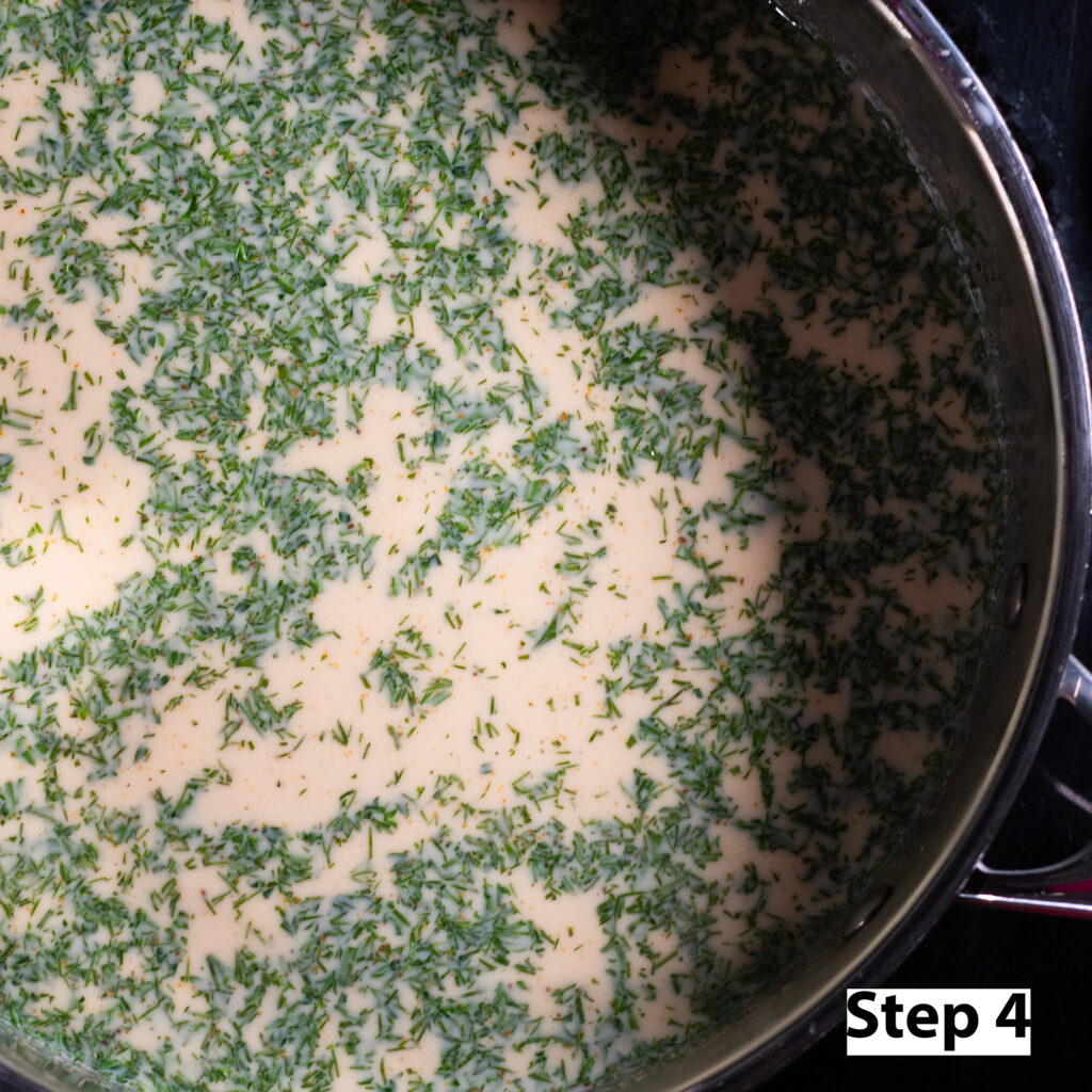 Step 4. In a saucepan over medium-high heat, add the evaporated milk, chopped dill, chopped parsley & Old Bay seasoning. Stir to incorporate and once the mixture comes to a gentle simmer immediately reduce the heat to the lowest setting.