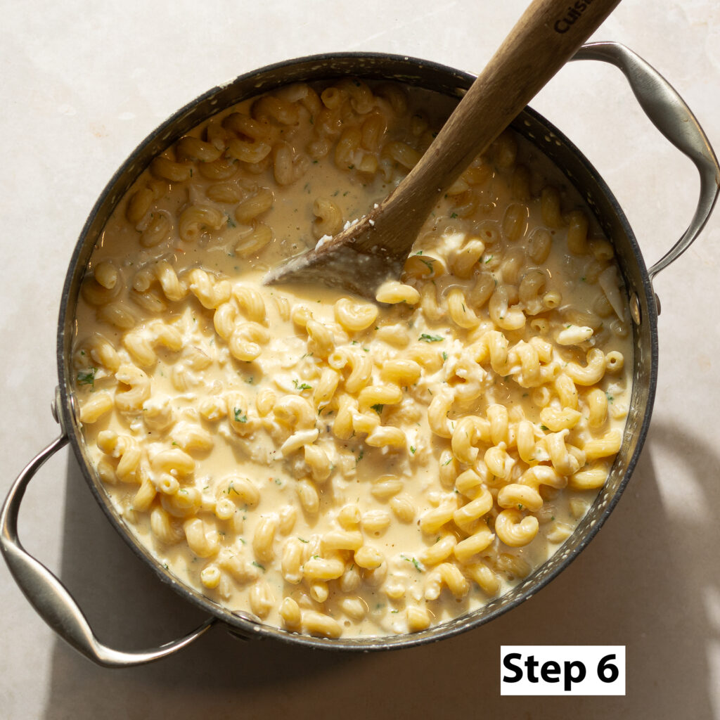 Step 6. Add the boiled pasta and the lump crab meat to the cheese sauce and mix for 2-4 minutes. As you agitate the pasta, it will release some of its starch, thickening the sauce slightly and making it more cohesive.