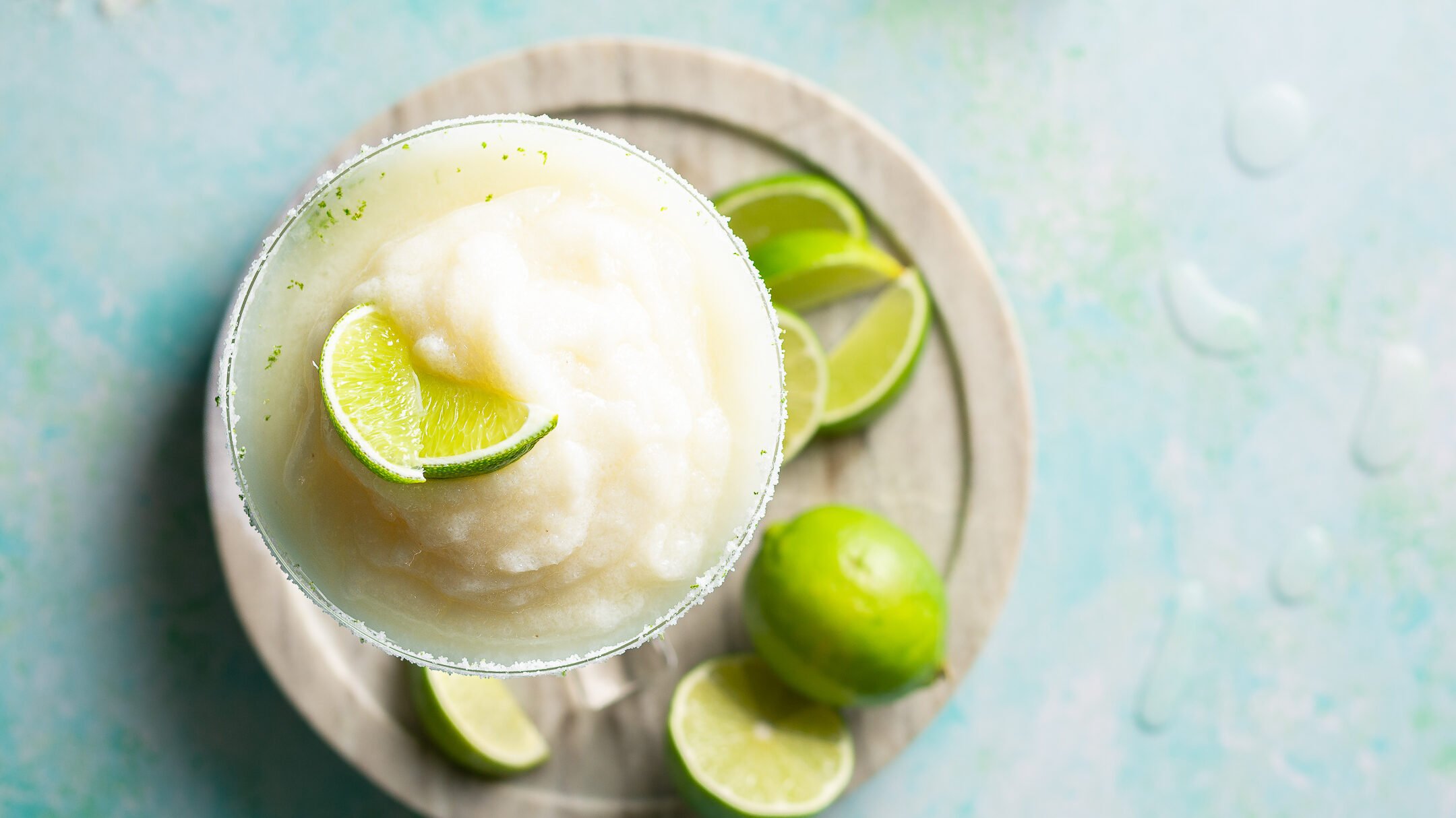 - Moisten rim of margarita glass by running a lime wedge around outer edge.