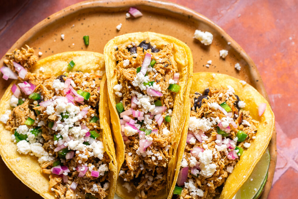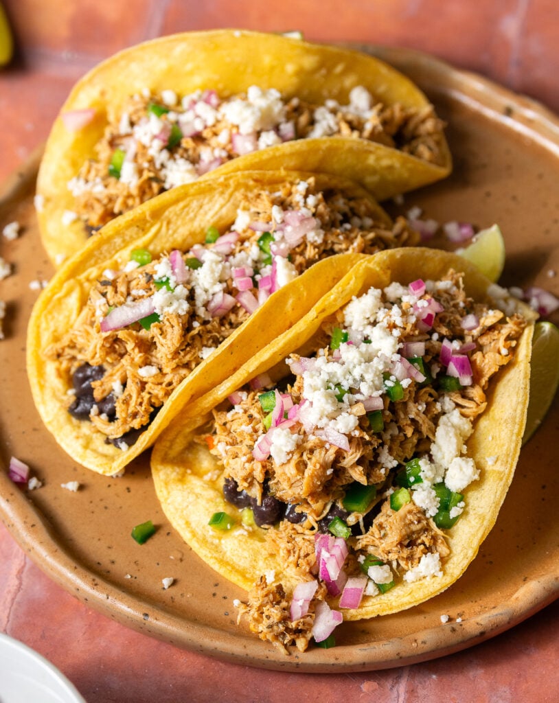- Add the shredded chicken from earlier and layer on the rest of your desired toppings. Using a lime wedge squeeze lime juice on each tortilla before eating. Enjoy hot!