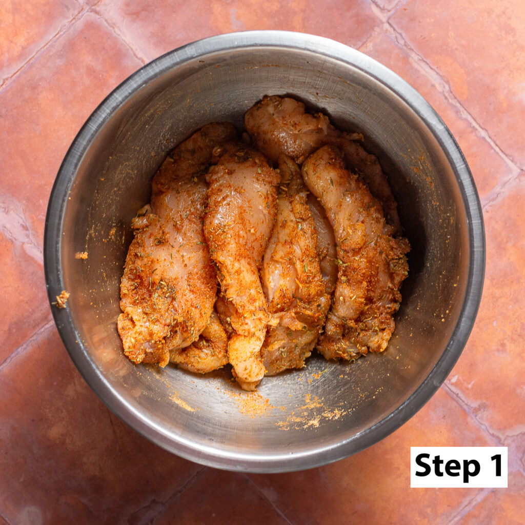 Step 1. Trim the chicken of any excess fat or cartilage and then add all the seasonings except the salt & cayenne pepper. Toss to evenly distribute.