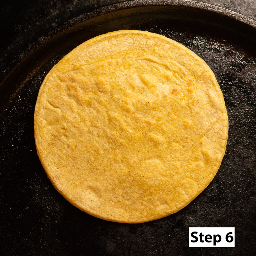 The goal is not to crisp the tortillas, only to lightly caramelize and heat them. The tortillas should still be flexible and you should be able to make a fist with them in your hand without them crumbling.