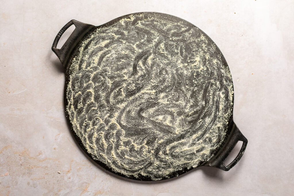 Step 2. Dust a heavy pan liberally with equal parts cornmeal and flour and turn out the risen dough onto the pan. A heavy pan such as cast iron heats up more quickly and retains heat more efficiently allowing you to get a nice crust on the underside of the pizza. The dough is more likely to stick to a lightly floured surface, especially as it is stretched.