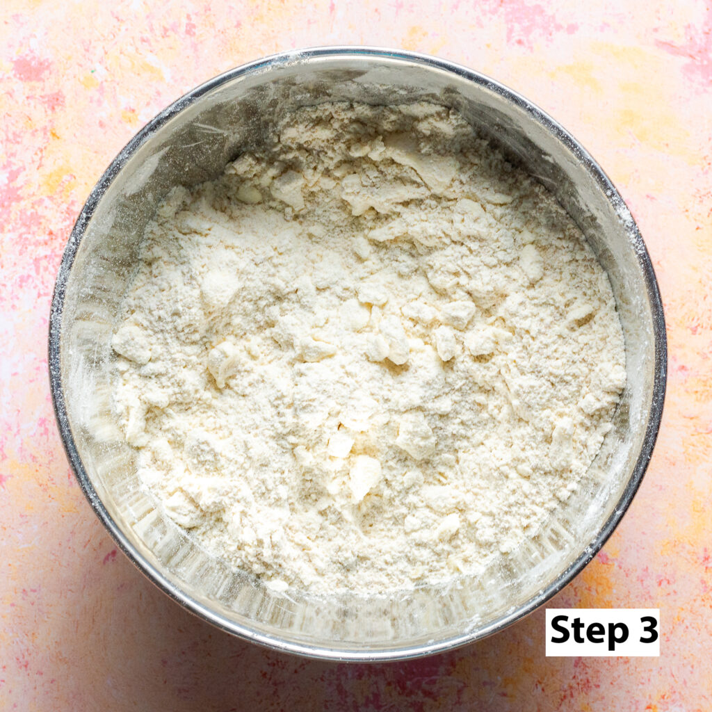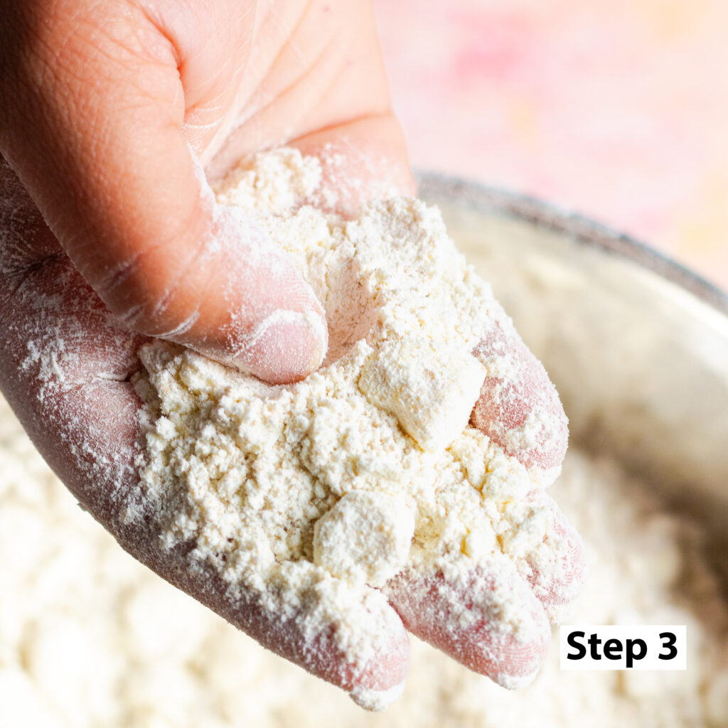 - Cube 8 tablespoons (½ cup) of the butter and rub it into the dry ingredients from the previous step until the mixture mostly resembles fine sand but still has some chunks of butter.