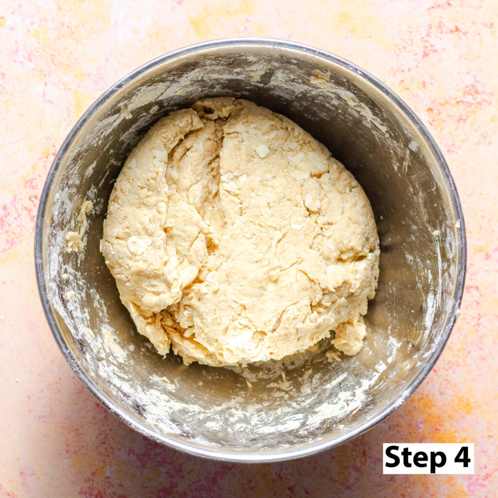 Step 4. Add the buttermilk and, using your hands, form the mixture into a dough just until combined. Avoid using a full kneading motion as kneading til smooth will likely cause the butter to melt/absorb into the dough - taking away from our flaky layers. Instead, push the dry ingredients into the wet portion of the dough repeating this until there are no more dry spots.