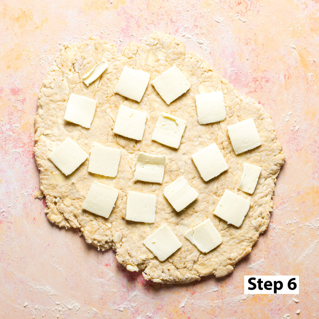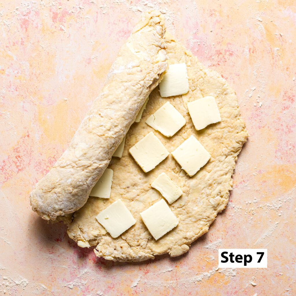 - Slice the remaining 4 tablespoons (¼ cup) of butter as thinly as possible and arrange them across the surface of the rolled out dough.