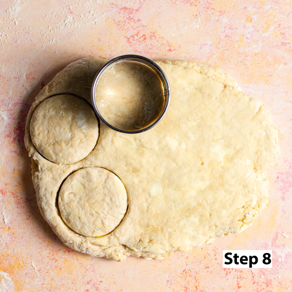 Step 8. Roll the dough out again until a half to three-quarters inch thick and cut into your desired shapes. If using biscuit cutters, do not twist to release.