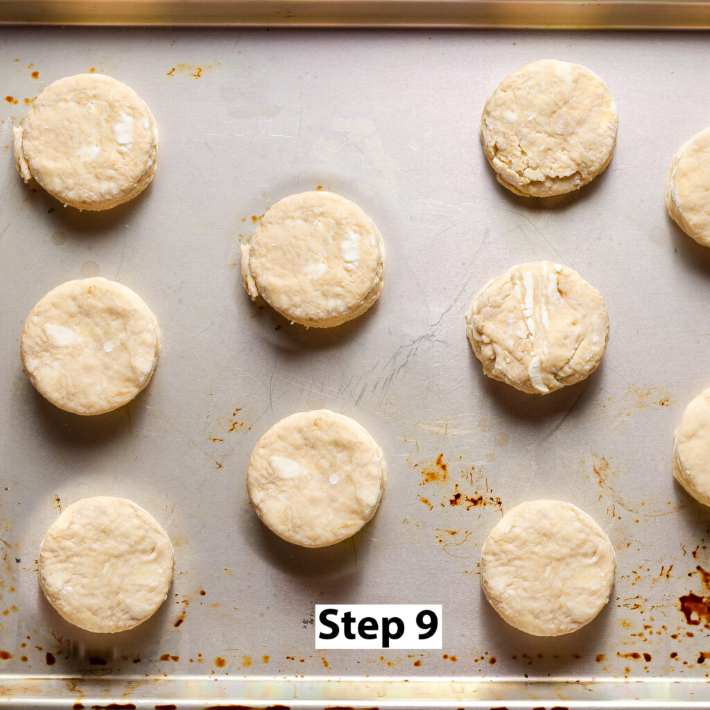 Step 9. Arrange the biscuits on a baking sheet leaving at least an inch of space around each for proper air circulation so the biscuits bake evenly. Alternatively, you can arrange in a pan closer together for pull-apart biscuits.