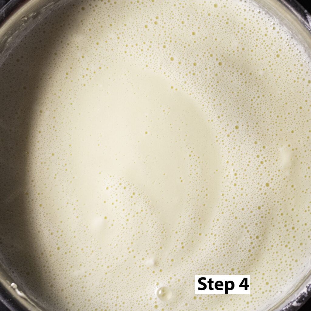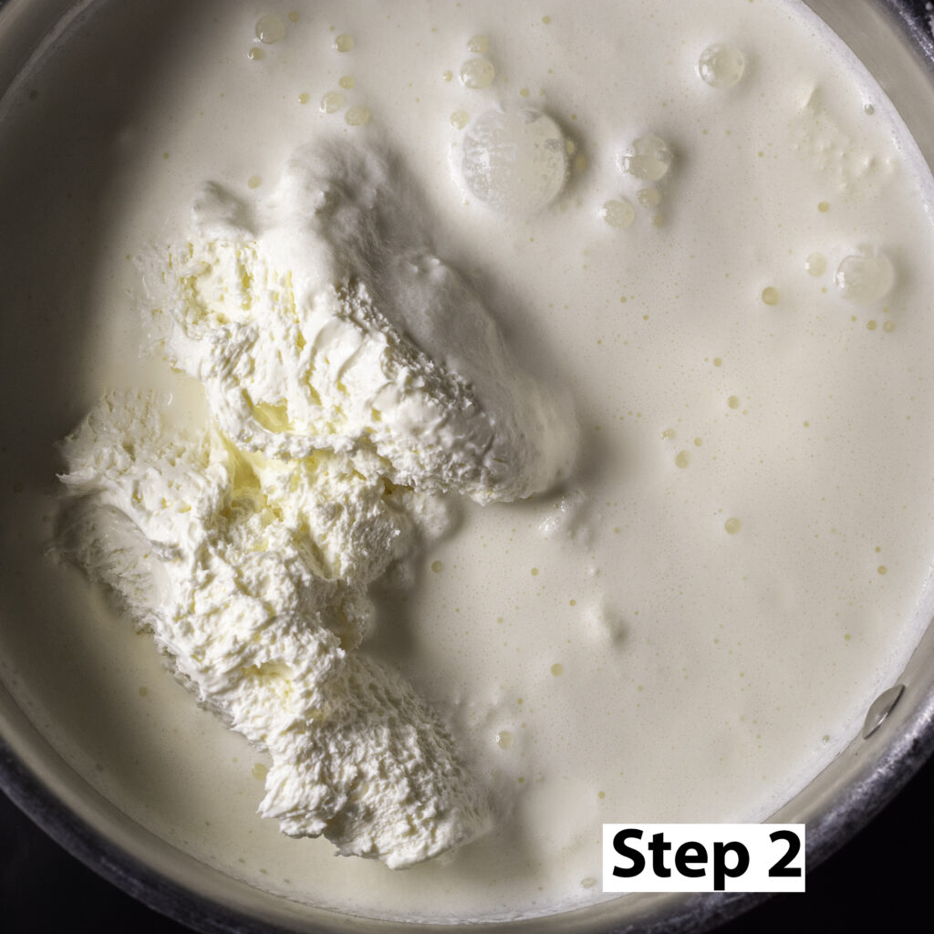 Step 2. In a medium saucepan add the rest of the granulated sugar, the milk, heavy cream, cream cheese & salt. Stir over medium heat until the mixture comes to a gentle simmer and the cream cheese is fully melted.