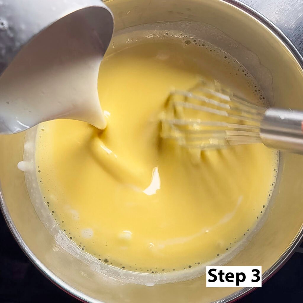 Step 3. Once the heavy cream mixture has come to a simmer temper the egg yolks from step 1 by adding a cup of the heavy cream mixture at a time. Make sure to continually whisk the egg yolks to avoid any hotspots that can cause the yolks to "scramble."