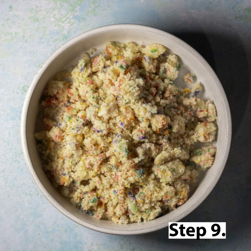 - Once the cake has completely cooled, crumble and set aside in an airtight container or Ziploc bag until ready for layering.