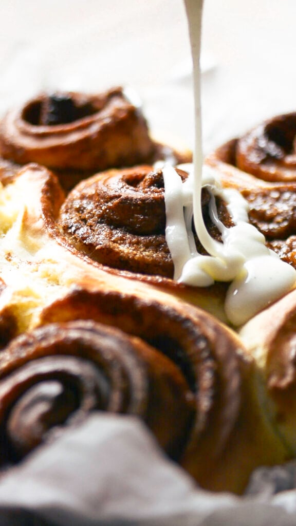 If you only have a dark pan but would prefer the underside of your cinnamon rolls to be less caramelized and remain softer, line your baking pan with parchment paper like I did!