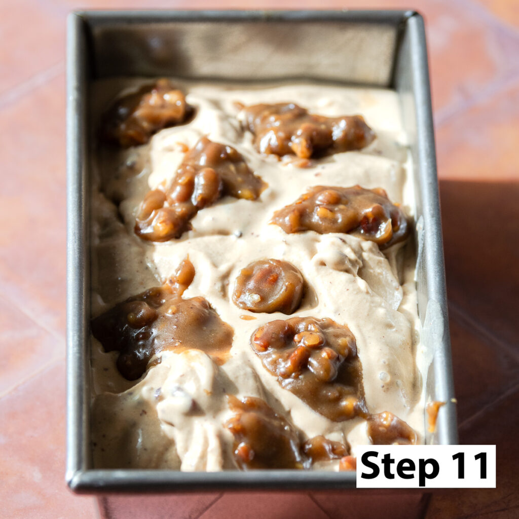 Step 11. Assemble the ice cream in a freezer -safe airtight container. Start by layering some of the ice cream and then drizzle or dollop some of the reserved salted pecan butterscotch on top. Repeat these layers until all of the ice cream and butterscotch have been used. You may use a toothpick or skewer to further distribute the butterscotch throughout all the ice cream!
