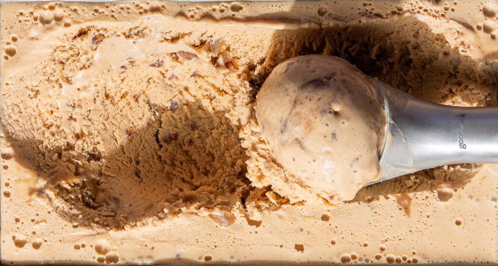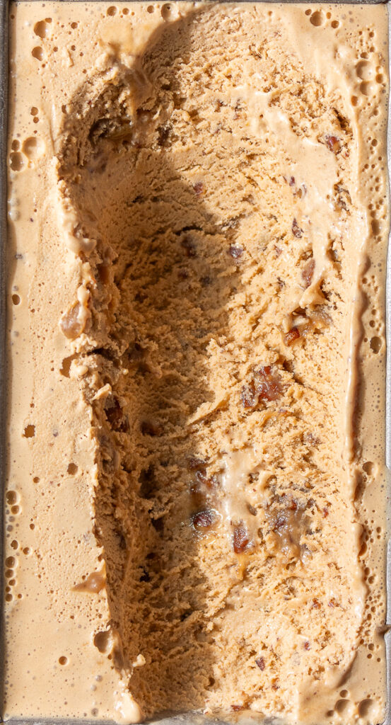 - High ratio of butterfat. Flavor follows fat so the fat content in this ice cream helps to intensify flavors like the subtle pecans that would otherwise be lost. Butterfat also slows melting while maintaining a soft-textured ice cream even fresh out the freezer!