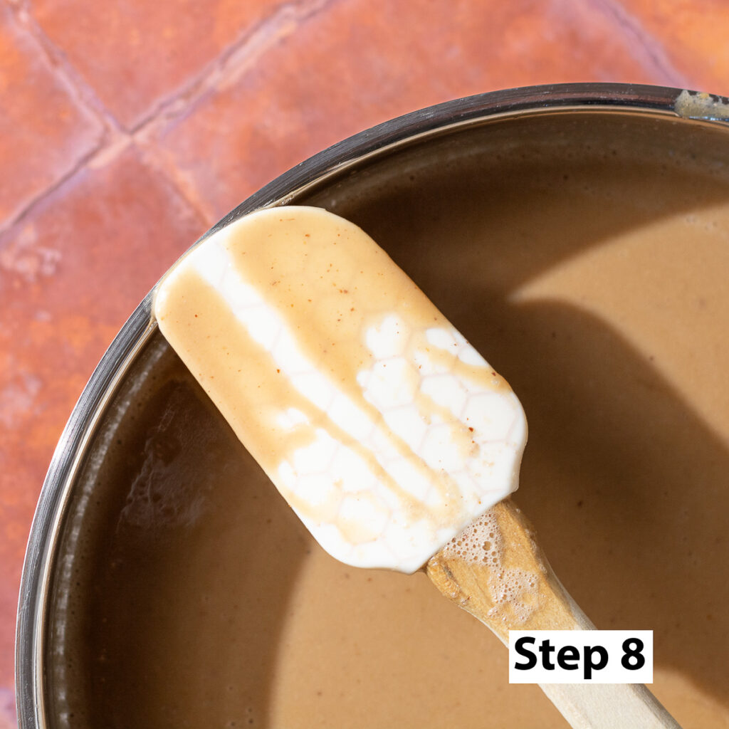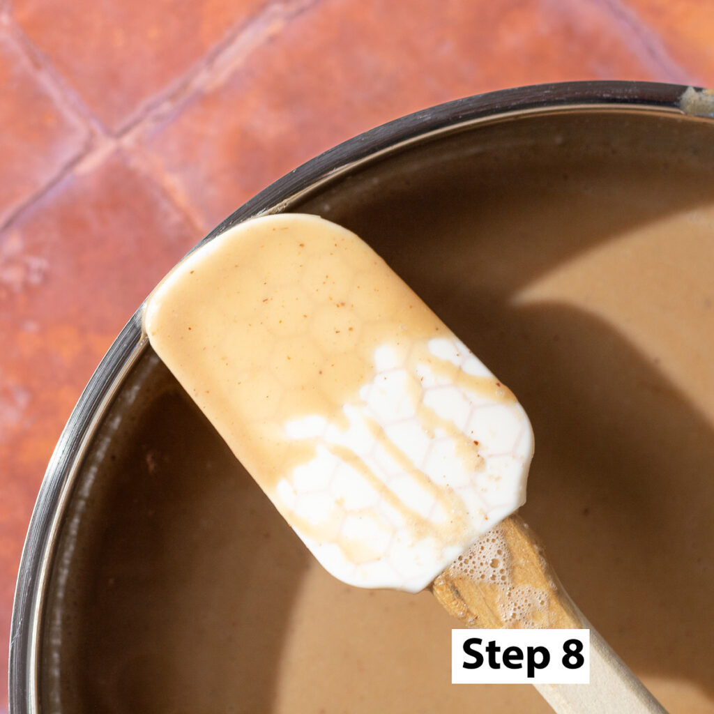 Step 8. Return the tempered custard mixture to the saucepan and stir over medium to medium-high heat just until the hot mixture coats the back of a spoon. Draw a finger across the spoon or spatula and the custard should be thick enough to leave a clean trail. The temperature of the custard mixture should be 160°F. It shouldn't exceed 165°F - past that and you run the risk of curdling the rich custard base.