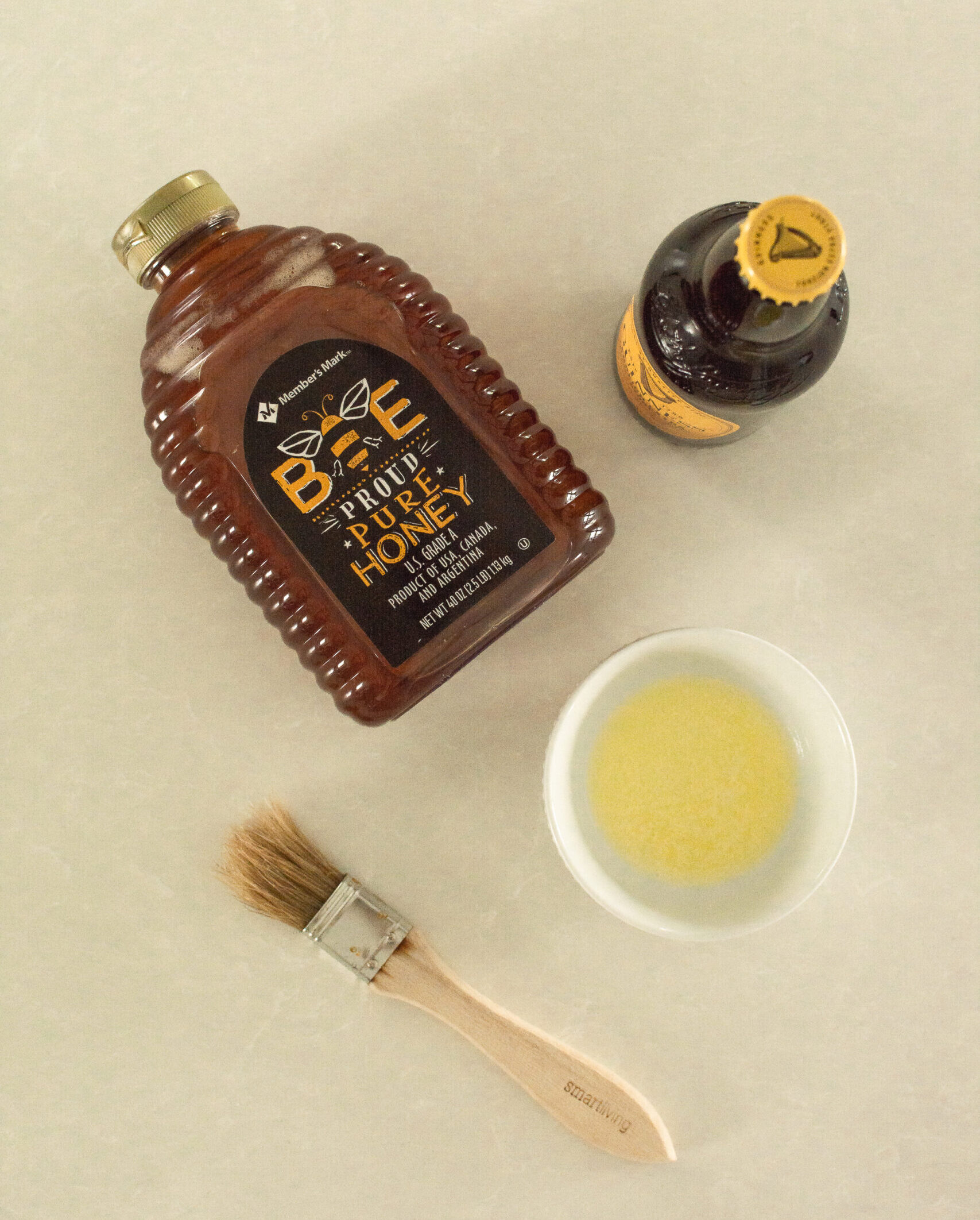 - Melt butter in small bowl then add honey and extra stout beer and mix