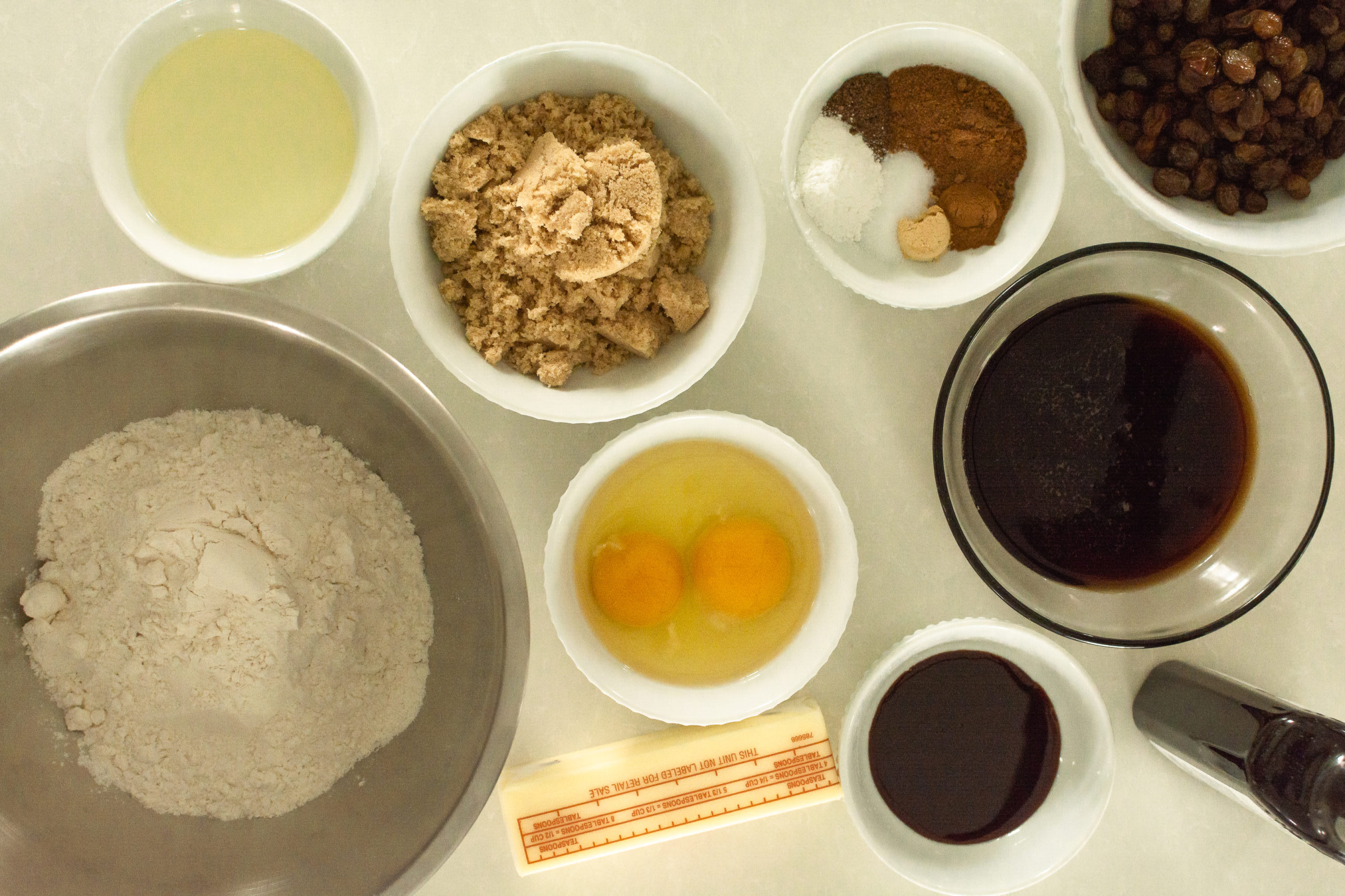- Drain extra stout beer from raisins into mixing bowl. Then also add dry ingredients, vanilla and molasses and mix until just combined.