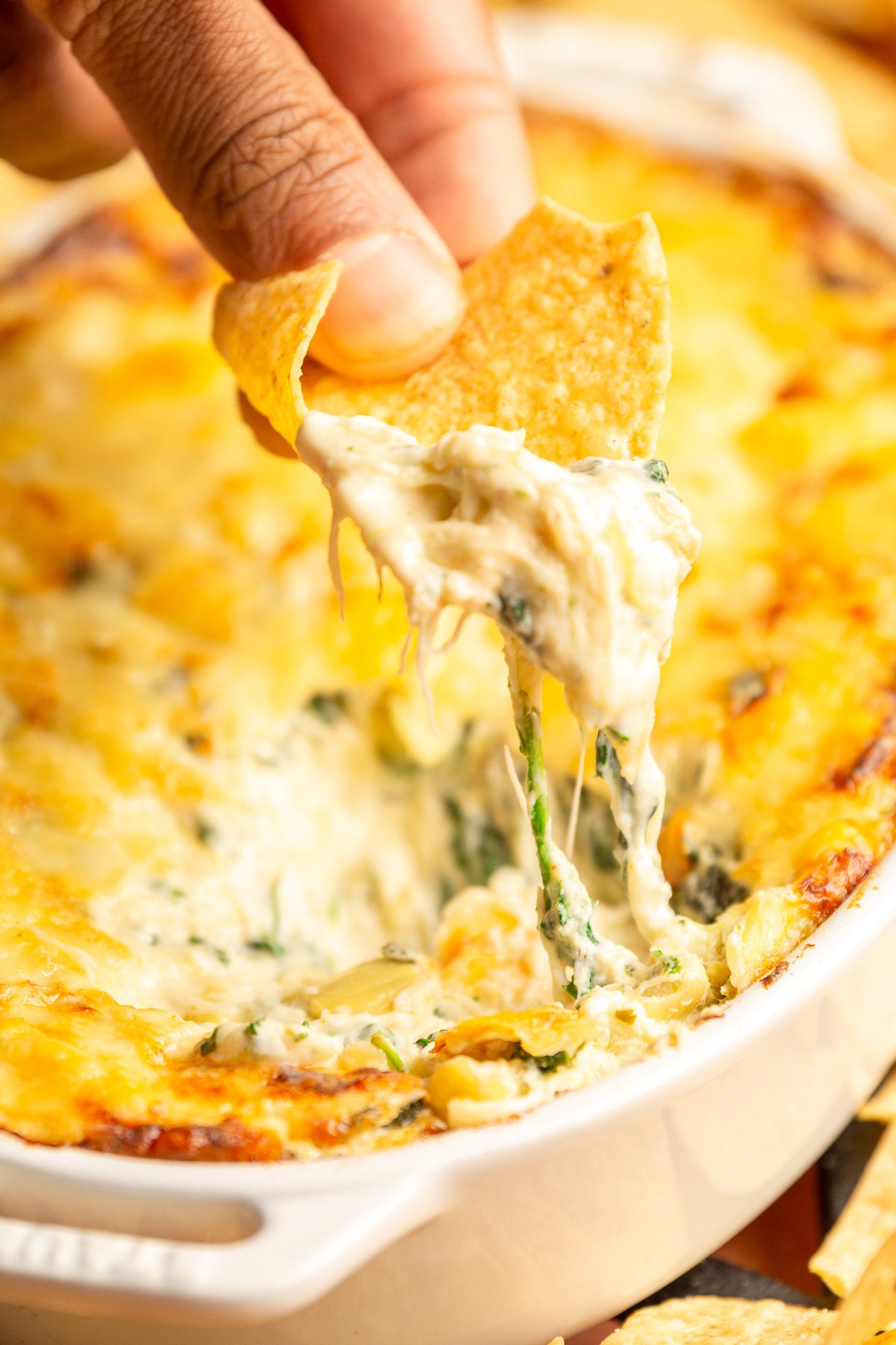 Artichoke hearts. I opt for canned. Drain them well to avoid a soupy, separated dip. If you opt for fresh artichokes, steam or roast them before incorporating into the dip and be sure to remove the choke. The choke is the central, fuzz and fibrous part of the artichoke and it is inedible.