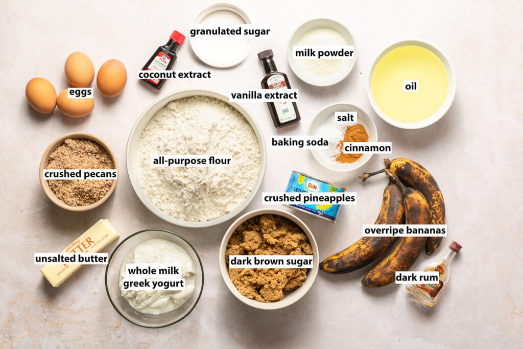 My version stays true to its roots while giving you everything you crave in a dessert: a super moist cake loaded with bananas, crushed pineapple, warm spices, layers of rich cream cheese frosting, and a sprinkle of crunchy pecans on top!