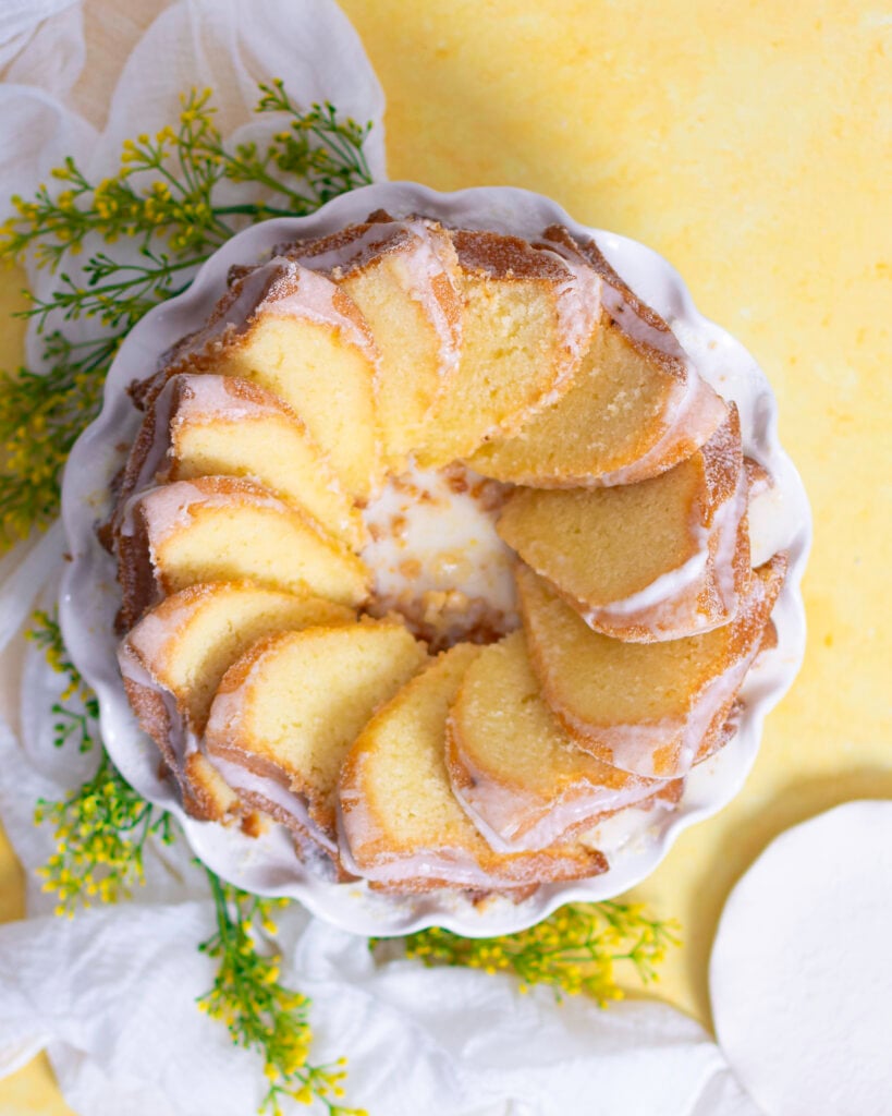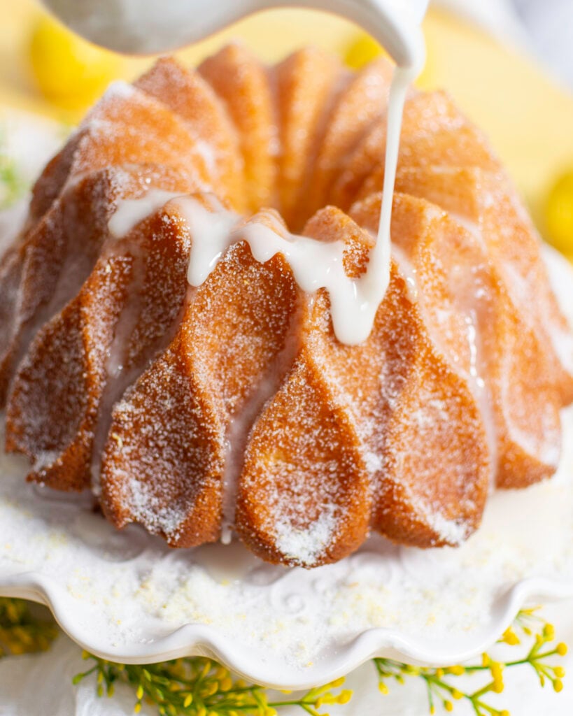 An airy lemon bundt cake coated in sugar flavored with freshly grated lemon zest and then topped off with a generous drizzle of lemon glaze frosting!