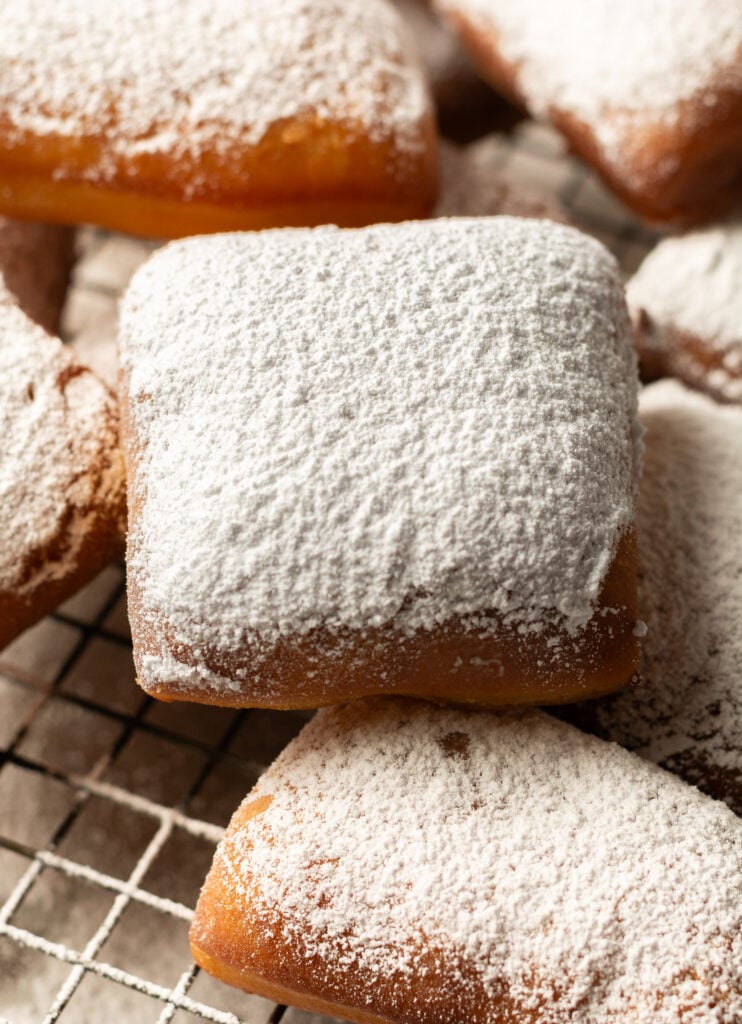 Can I make these New Orleans-style beignets in advance? These beignets are best served fresh out of the fryer. Although using all-purpose flour helps extend the time these beignets can sit out before they become chewy/dense, as they sit out moisture slowly evaporates eventually resulting in a drier and tougher texture.