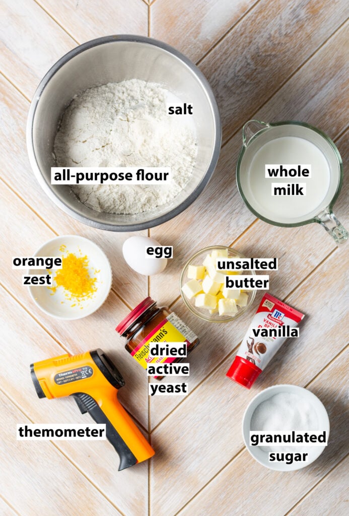 - Add all the ingredients - all-purpose flour, milk/yeast mixture, orange sugar, butter, egg, vanilla & salt to the bowl a stand mixer affixed with a dough hook. Knead for 3-5 minutes at medium speed or until the dough is smooth and clings mostly to the dough hook.