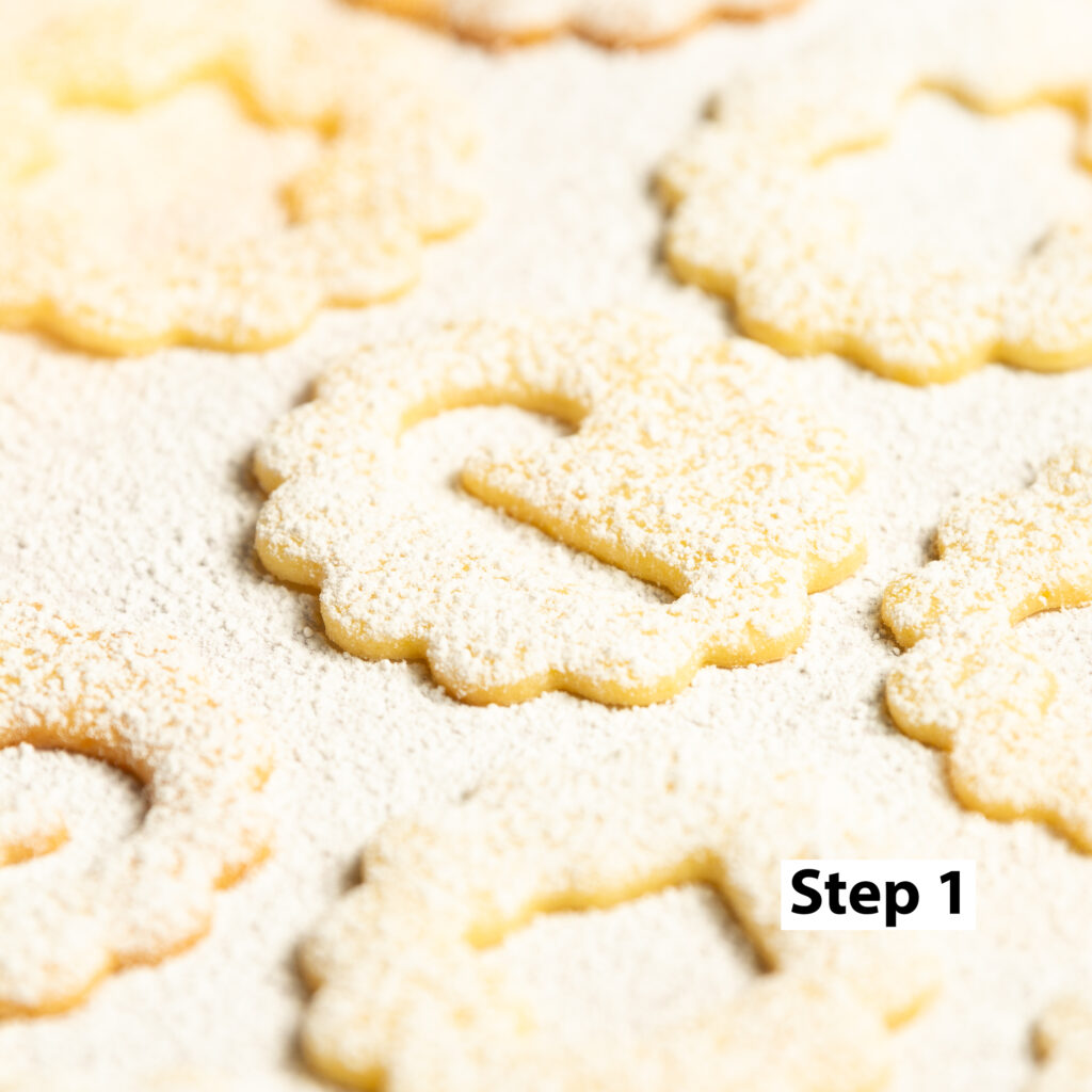 Step 1. Separate your top cookies with the "windows" from the base cookies. Using a fine-meshed sieve, sift confectioner's sugar on the top cookies.