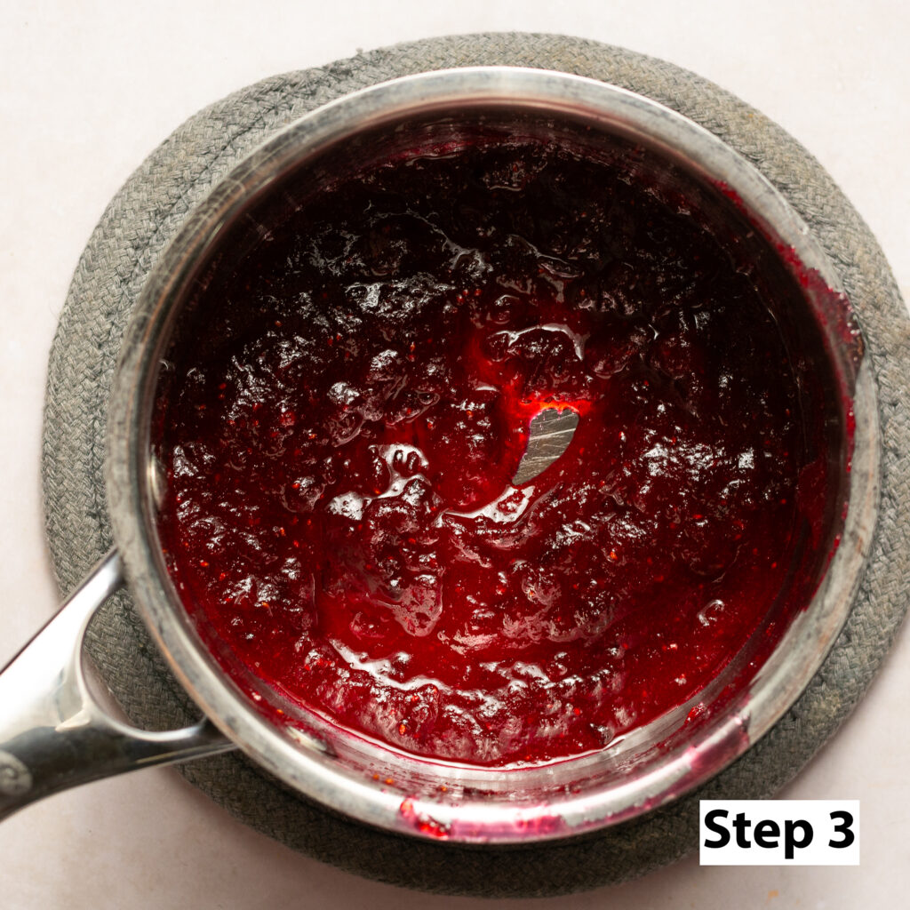- Add the sliced/mashed cranberries to a saucepan along with the granulated sugar and cornstarch. Reduce over low-medium heat until cranberries are softened and the liquid has a syrupy consistency. Remove from heat.