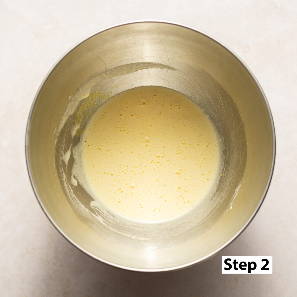 - Add the egg, orange zest and granulated sugar to a bowl and beat with a mixer until pale yellow.